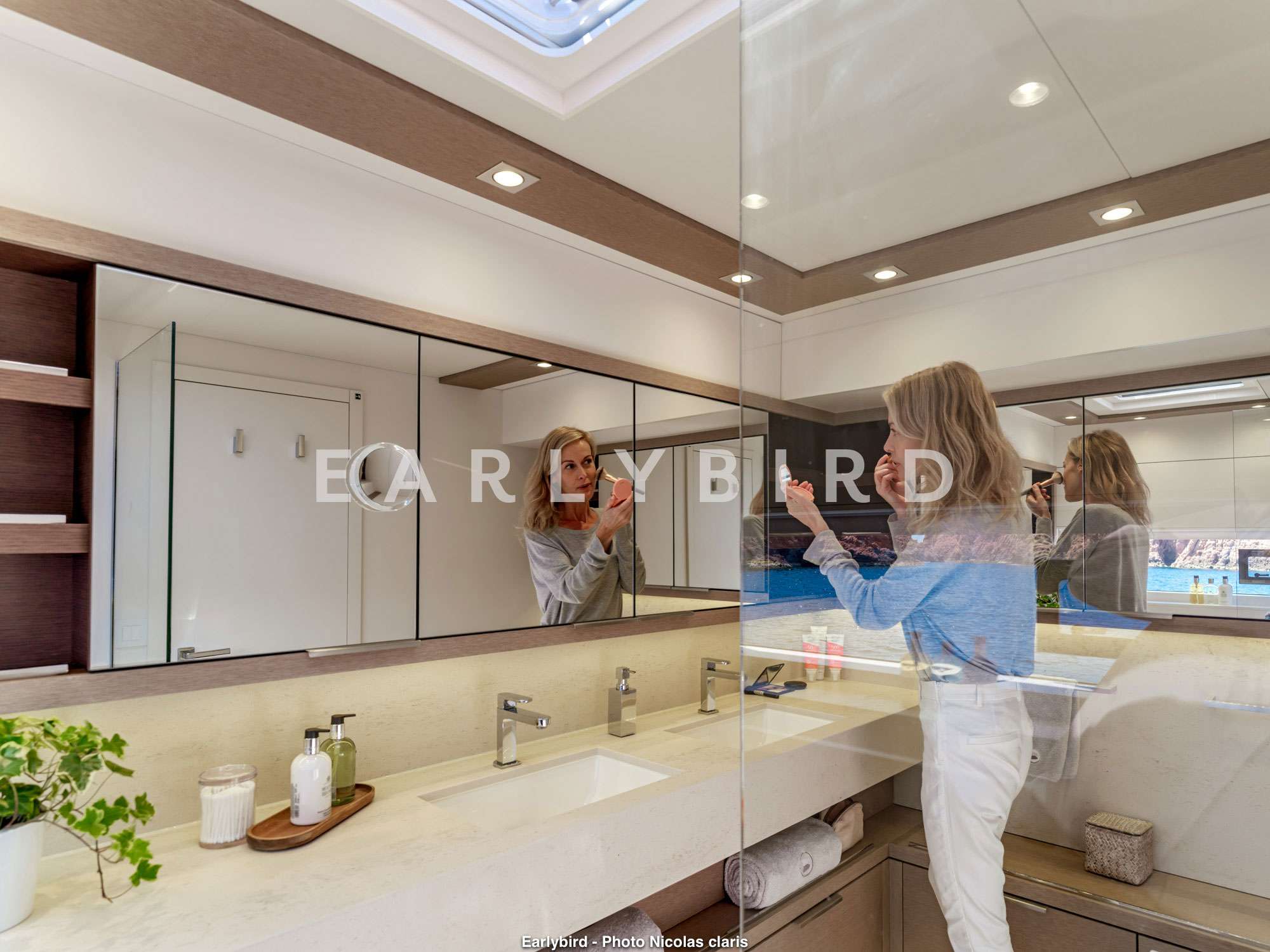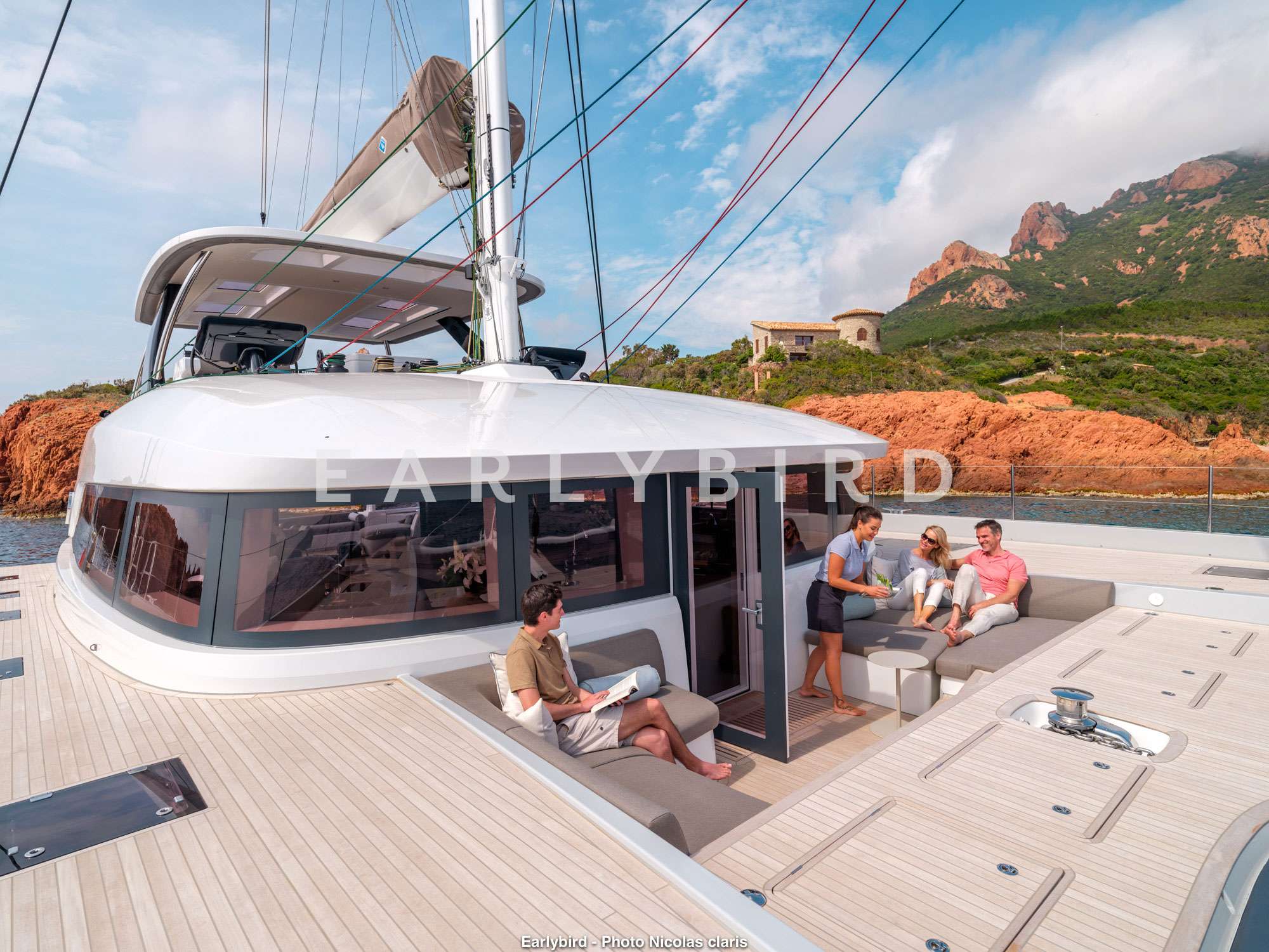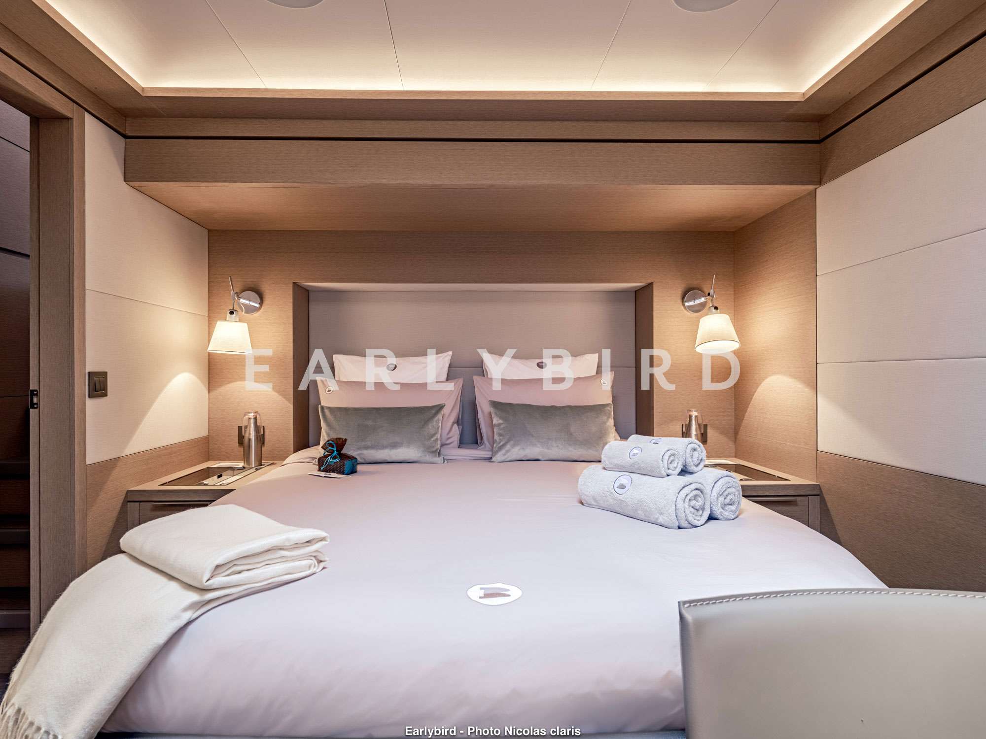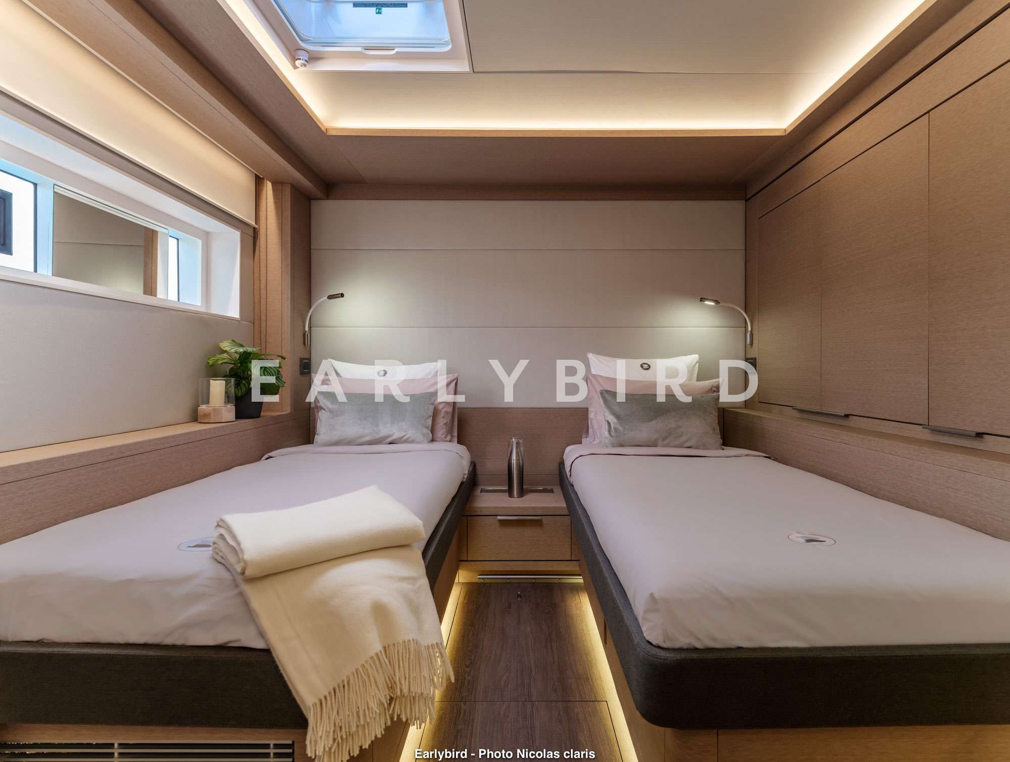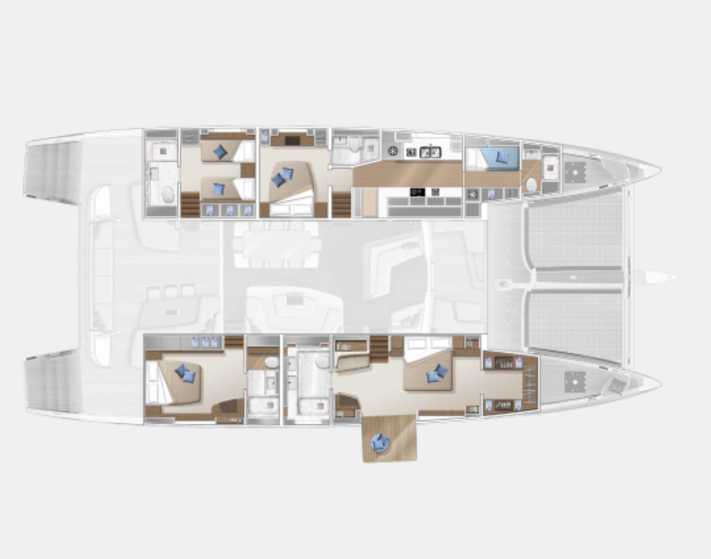 1 master cabin with the private balcony feature, 2 double and 1 twin cabin, galley is forward in the port hull with crew accommodation forward of it.