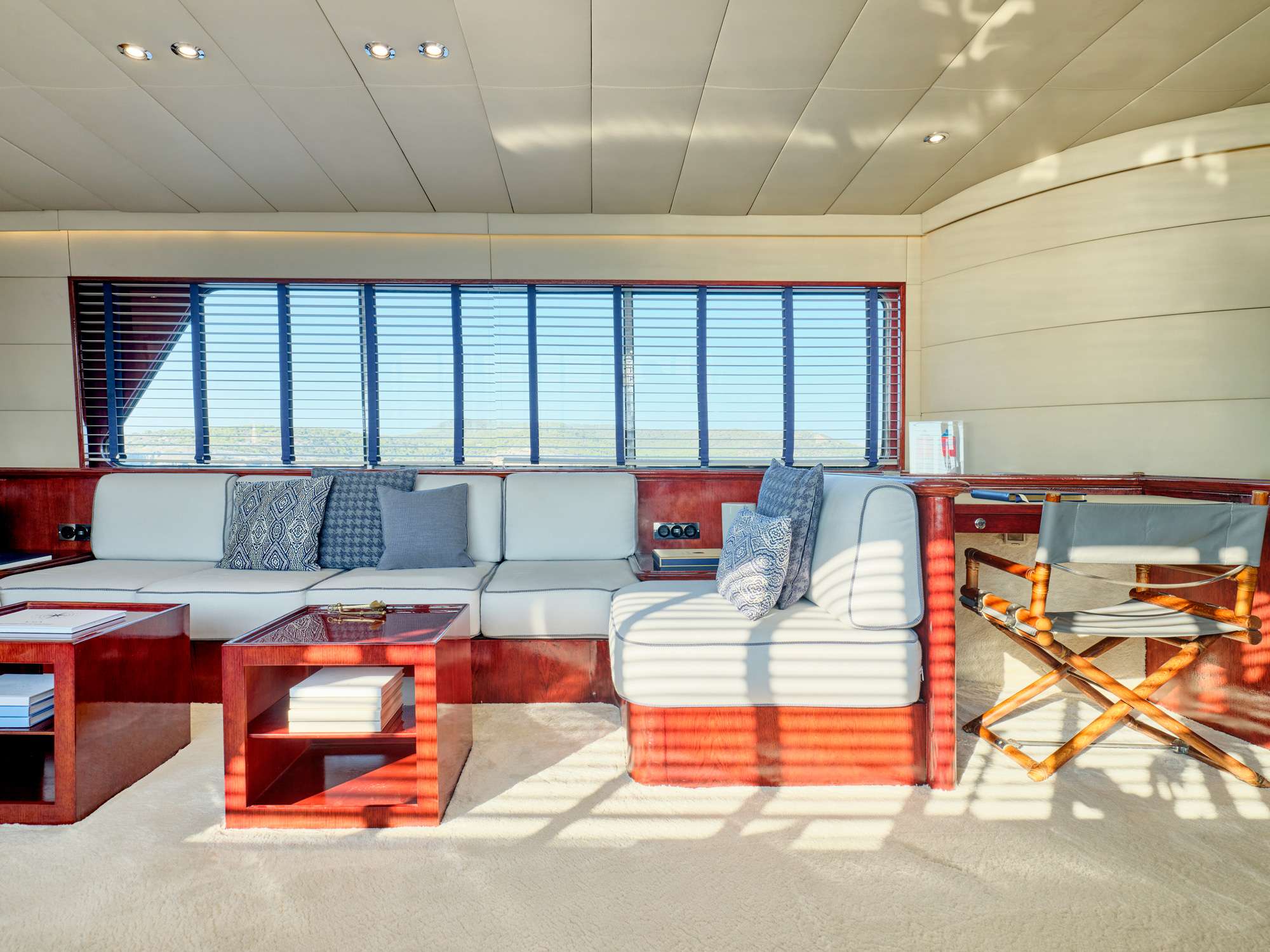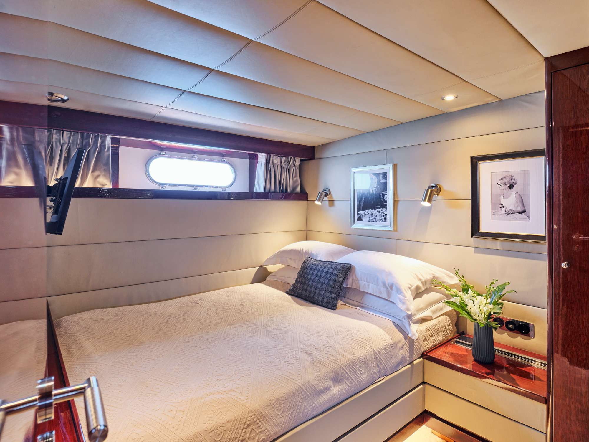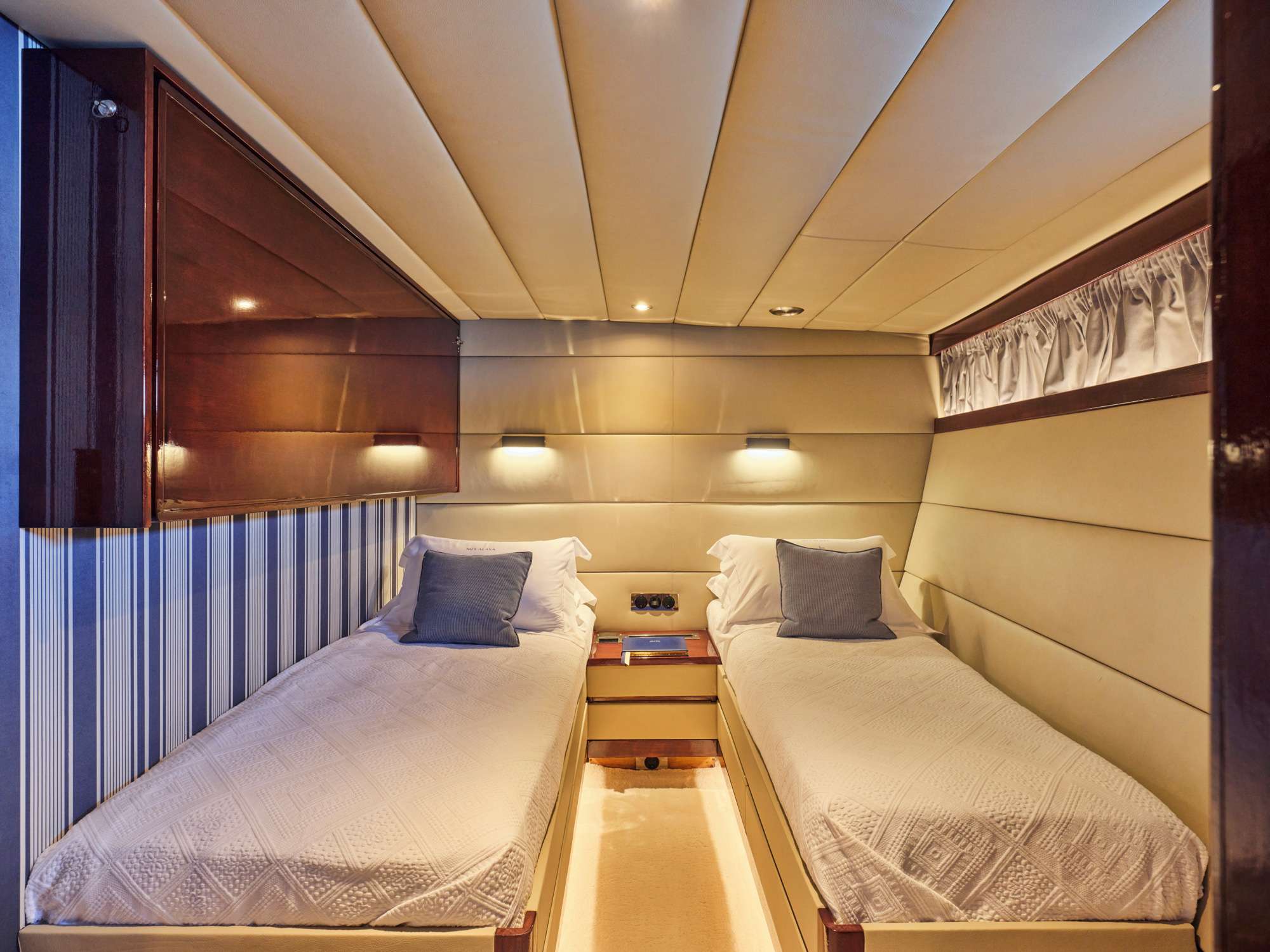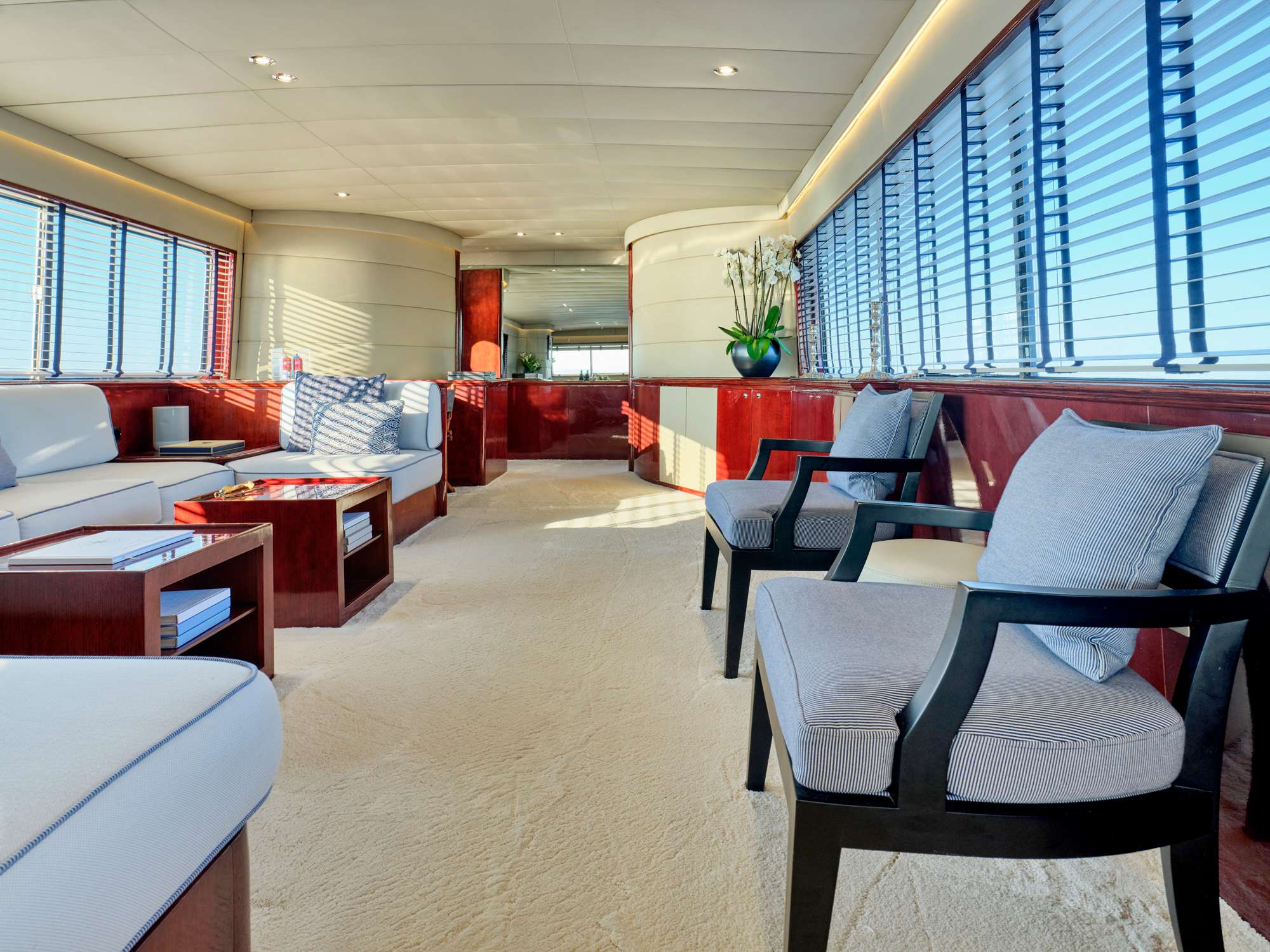 The main deck features a large salon area with card table corner and office space, and a separate dining room / lounge with large comfortable seating capacity. The 5 guest cabins are below deck.in 2 sections which are accessible by 2 stairs: the aft section is accessible by stairs at midship and includes a full beam master with king size bed (195x185cm) and a sofa (185x70cm) with en-suite, and 2 double cabins with en-suite each (bed sizes 185x130cm). The Forward section is accessible by stairs from the dining room and includes a 3rd double cabin of similar size with en-suite and a twin with pullman bed (3 single beds) with en-suite.