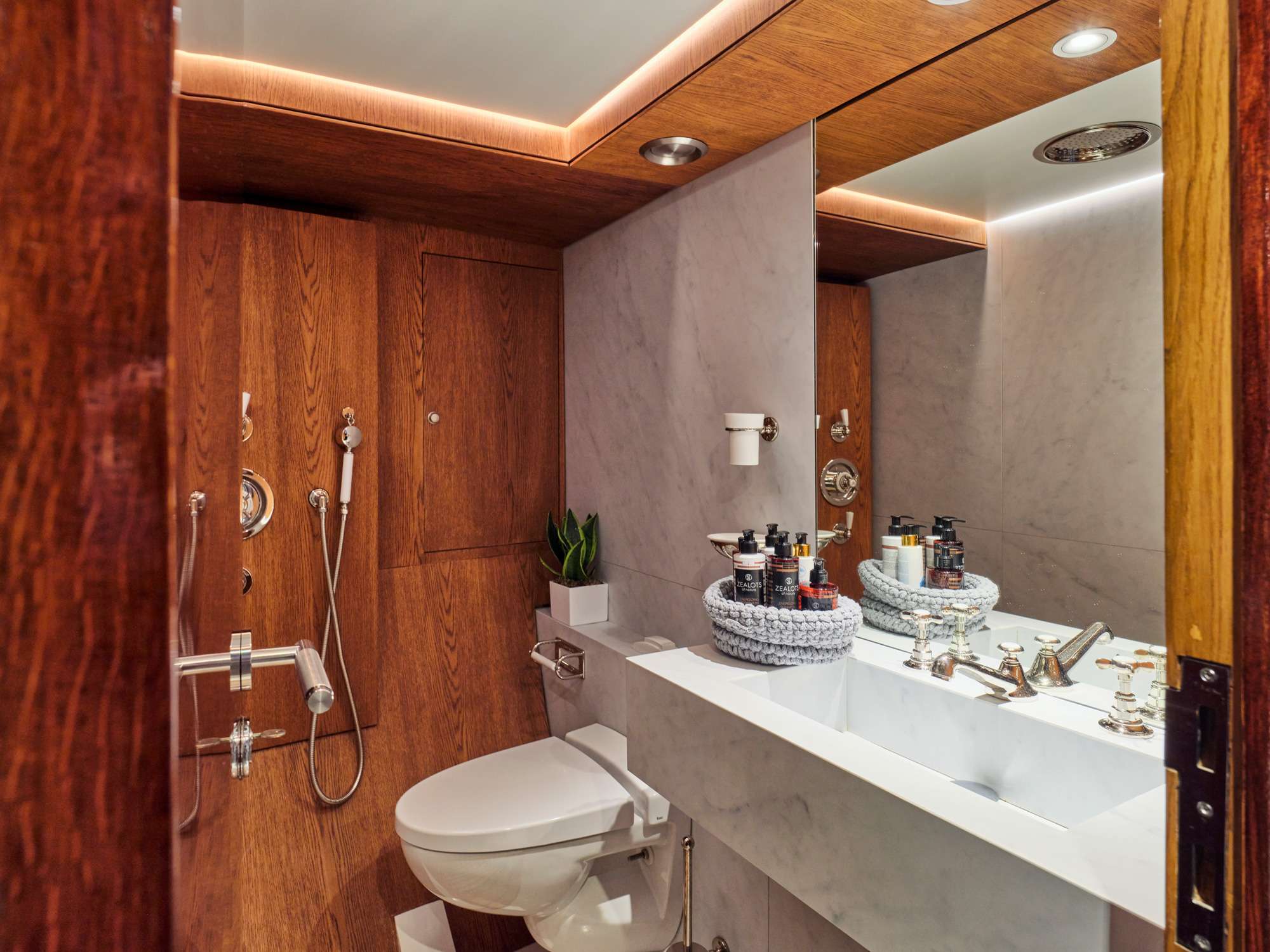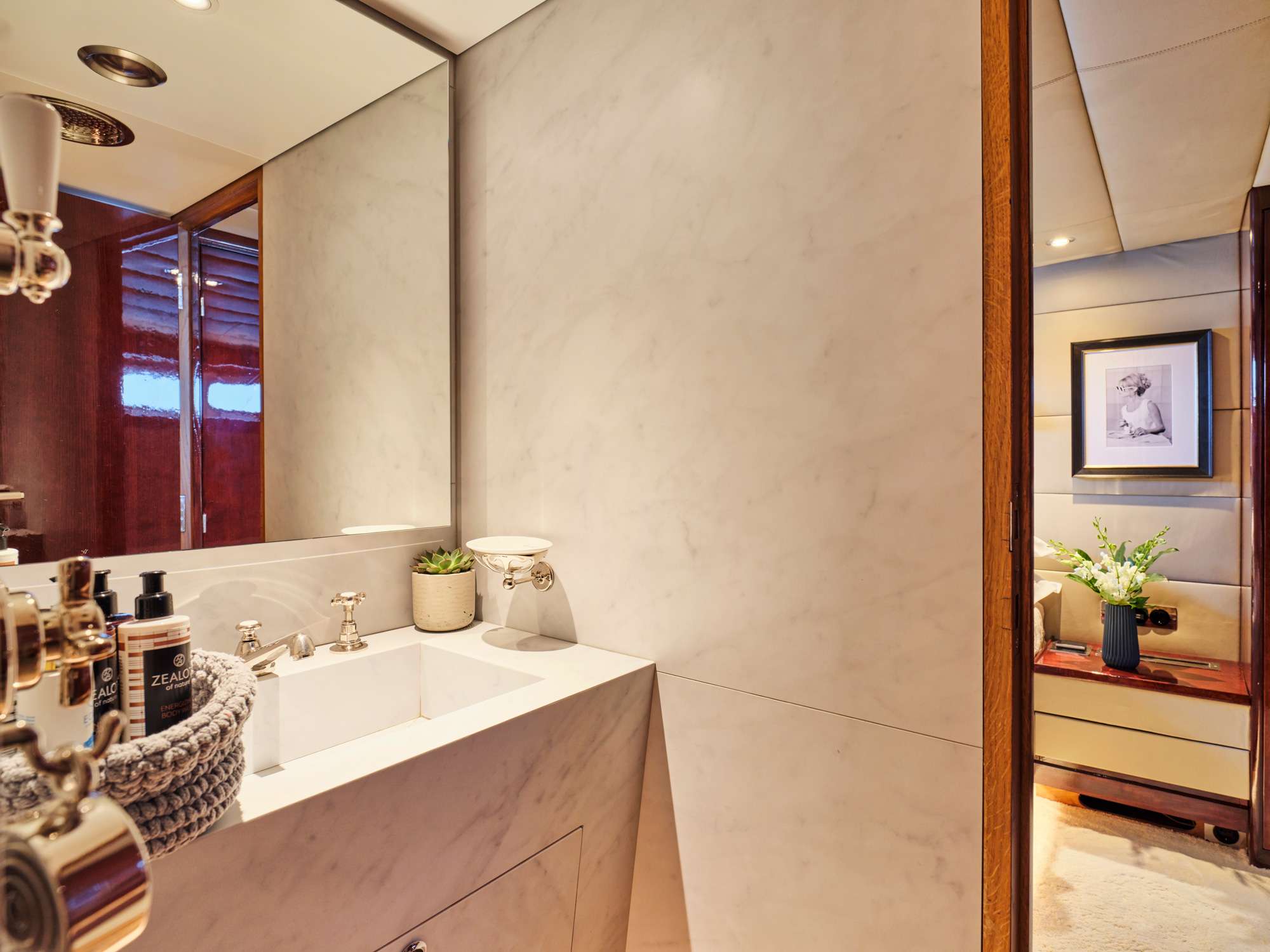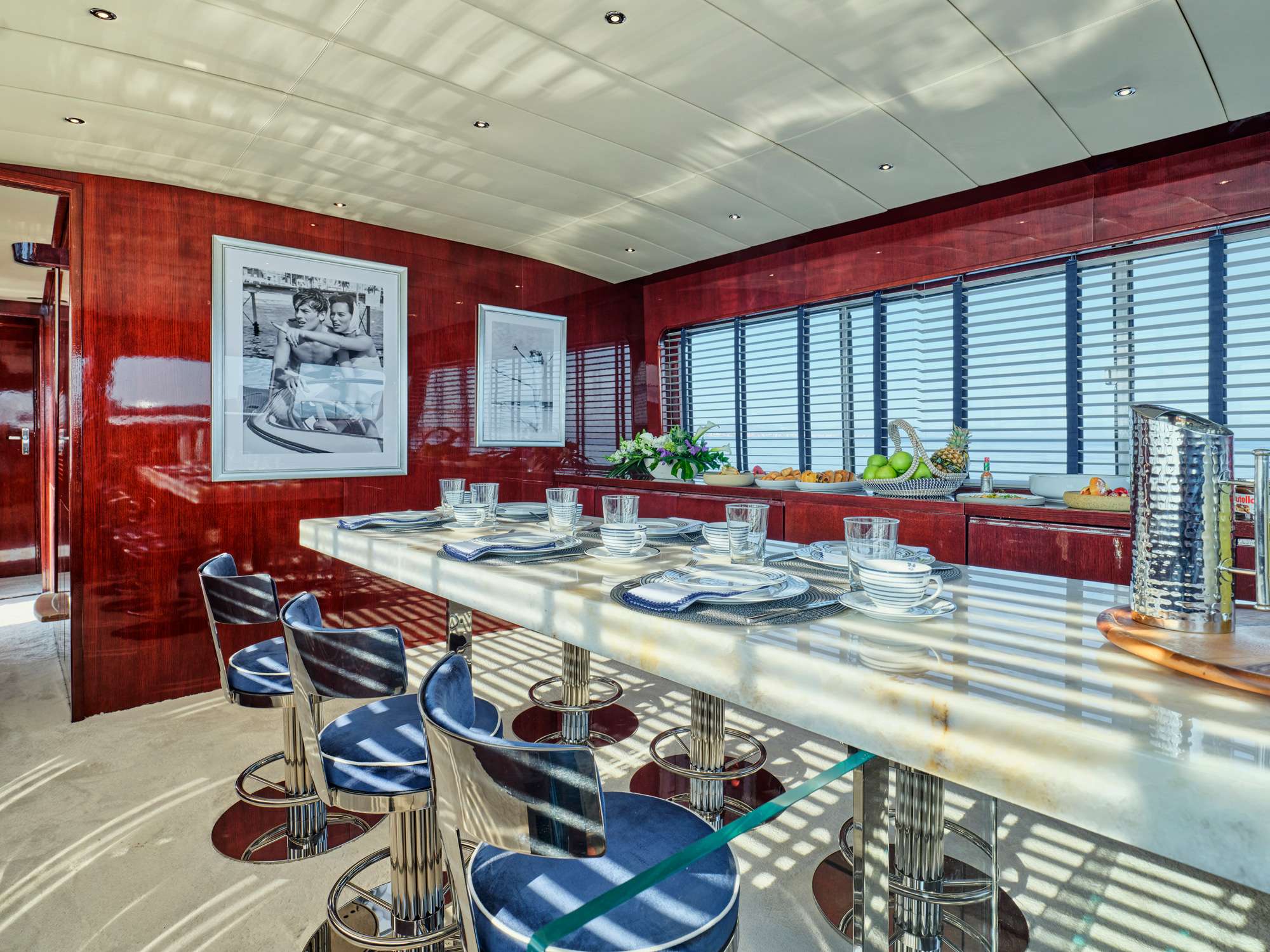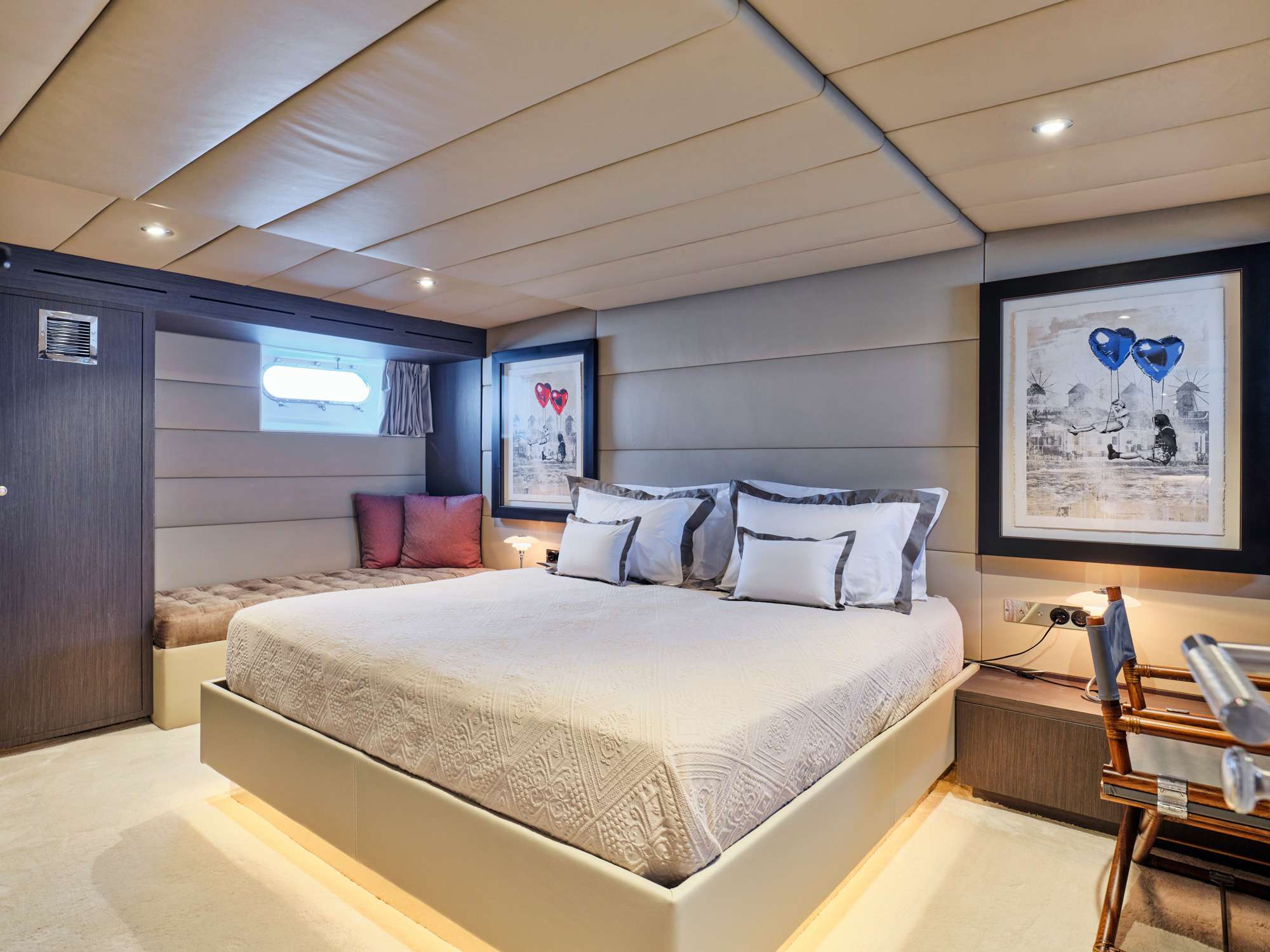 The main deck features a large salon area with card table corner and office space, and a separate dining room / lounge with large comfortable seating capacity. The 5 guest cabins are below deck.in 2 sections which are accessible by 2 stairs: the aft section is accessible by stairs at midship and includes a full beam master with king size bed (195x185cm) and a sofa (185x70cm) with en-suite, and 2 double cabins with en-suite each (bed sizes 185x130cm). The Forward section is accessible by stairs from the dining room and includes a 3rd double cabin of similar size with en-suite and a twin with pullman bed (3 single beds) with en-suite.