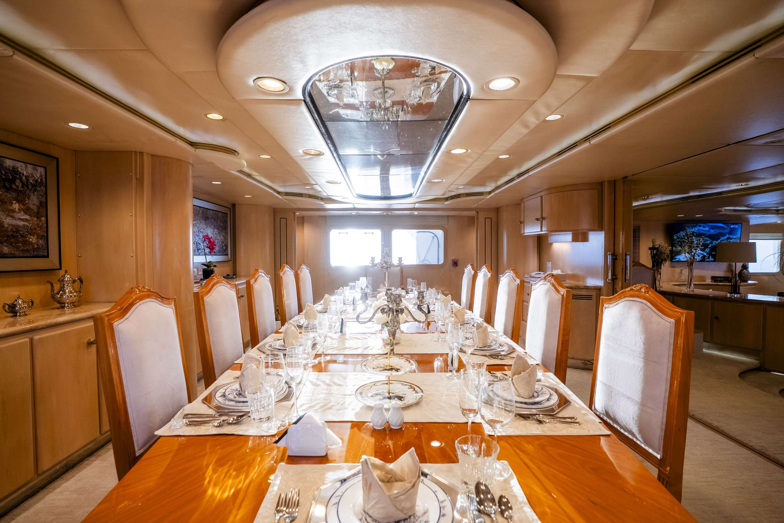 12 Guests can sit comfortably around the Main Salon Dining Table