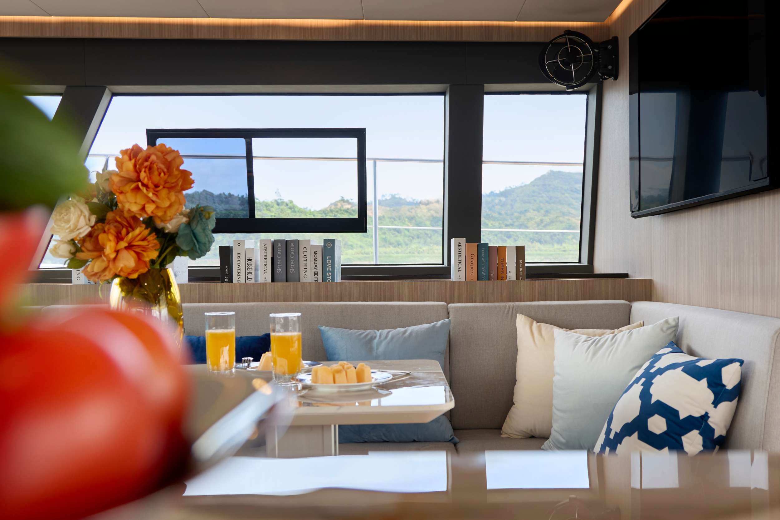 1700 watts of solar panels on the bimini roof and a large 58kwh Lithium battery bank that can operate the air conditioning for 8 hours without using a generator, reducing noise and fossil fuel use, especially at night while guests are sleeping. The vessel also uses electric induction cooking rather than traditional propane.