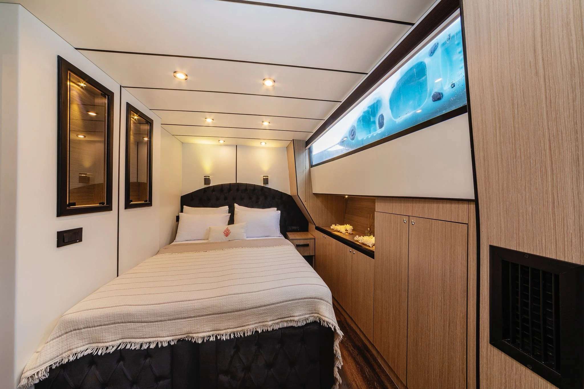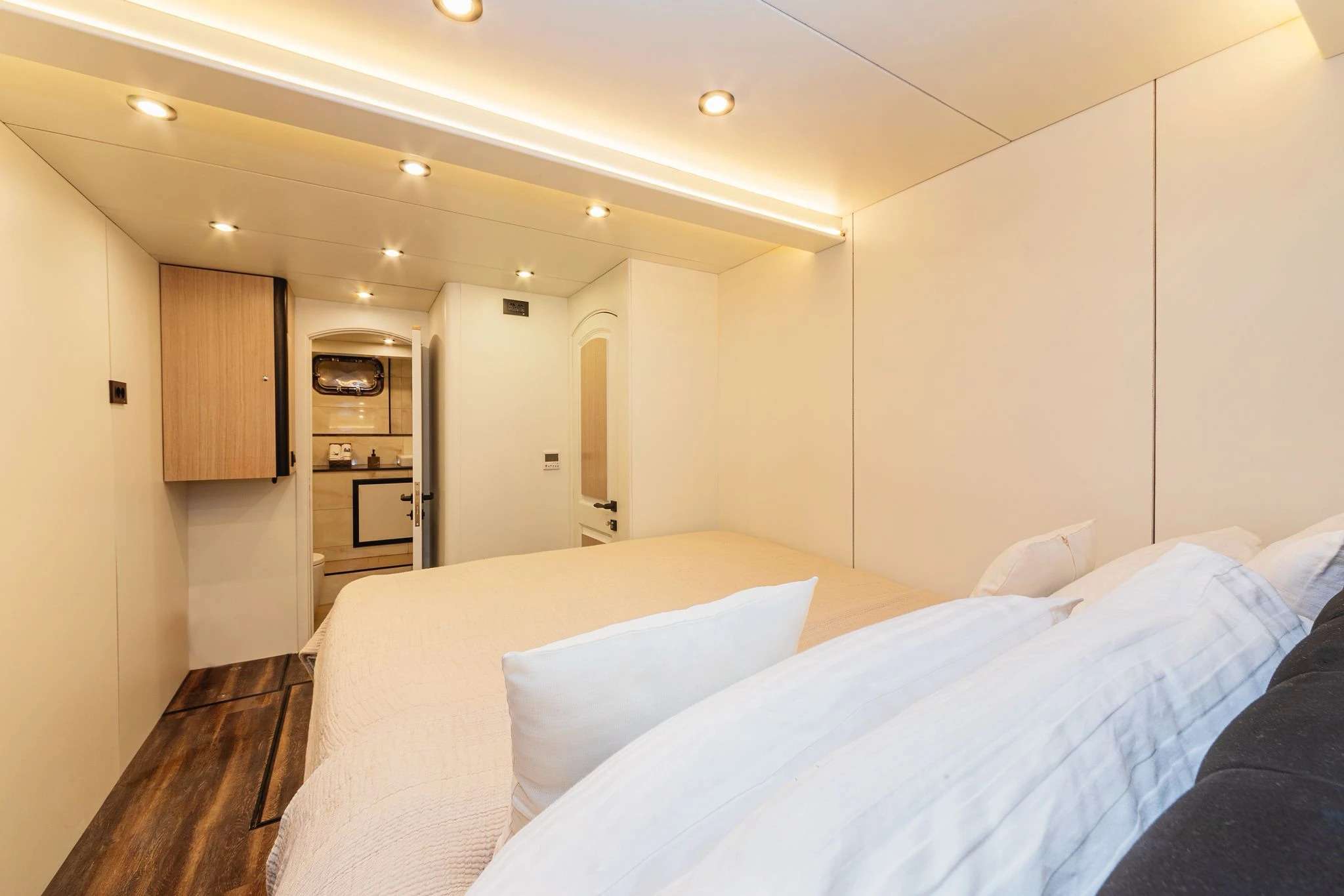 Spacious, air-conditioned cabins with private en-suite bathrooms and premium bedding.