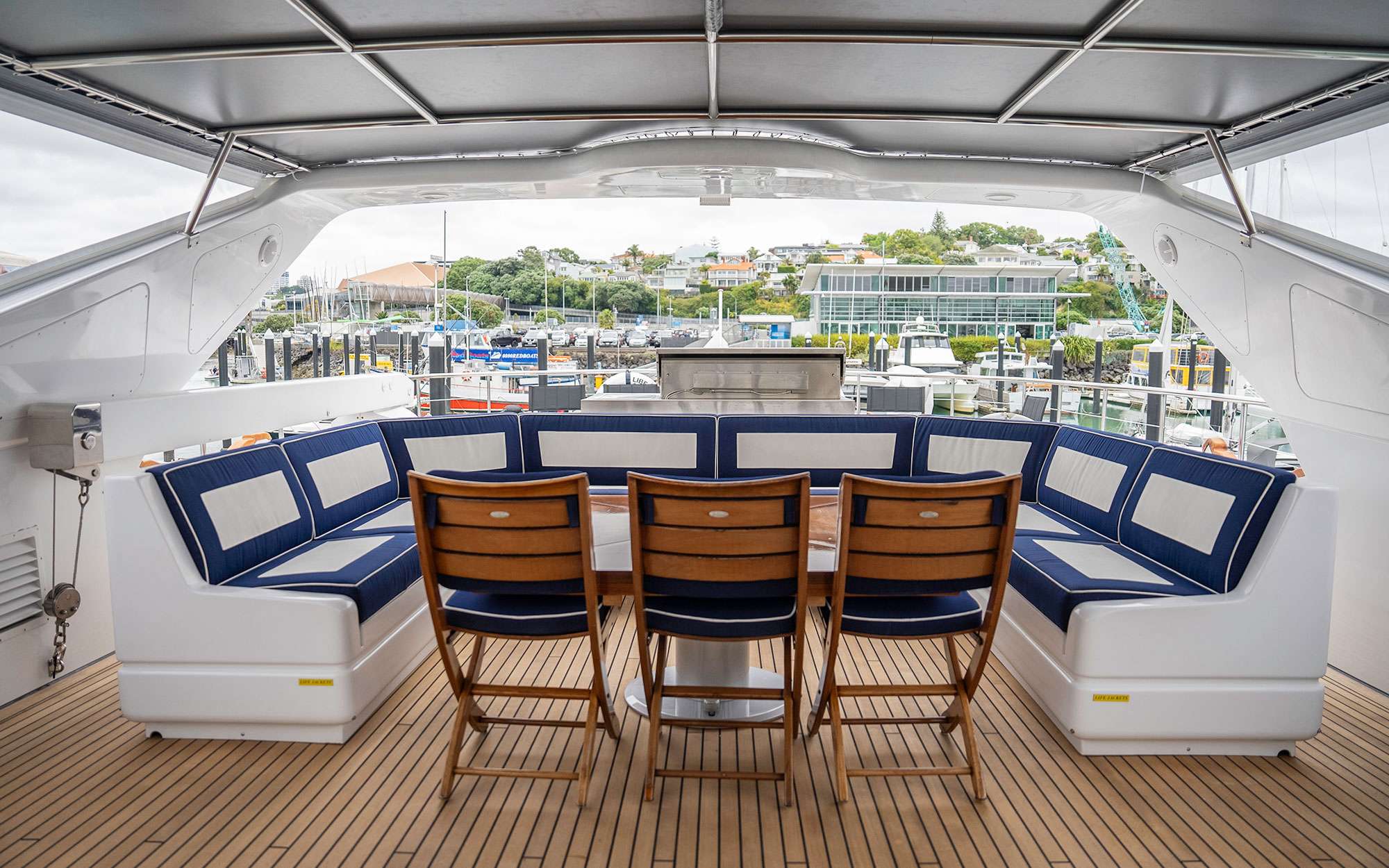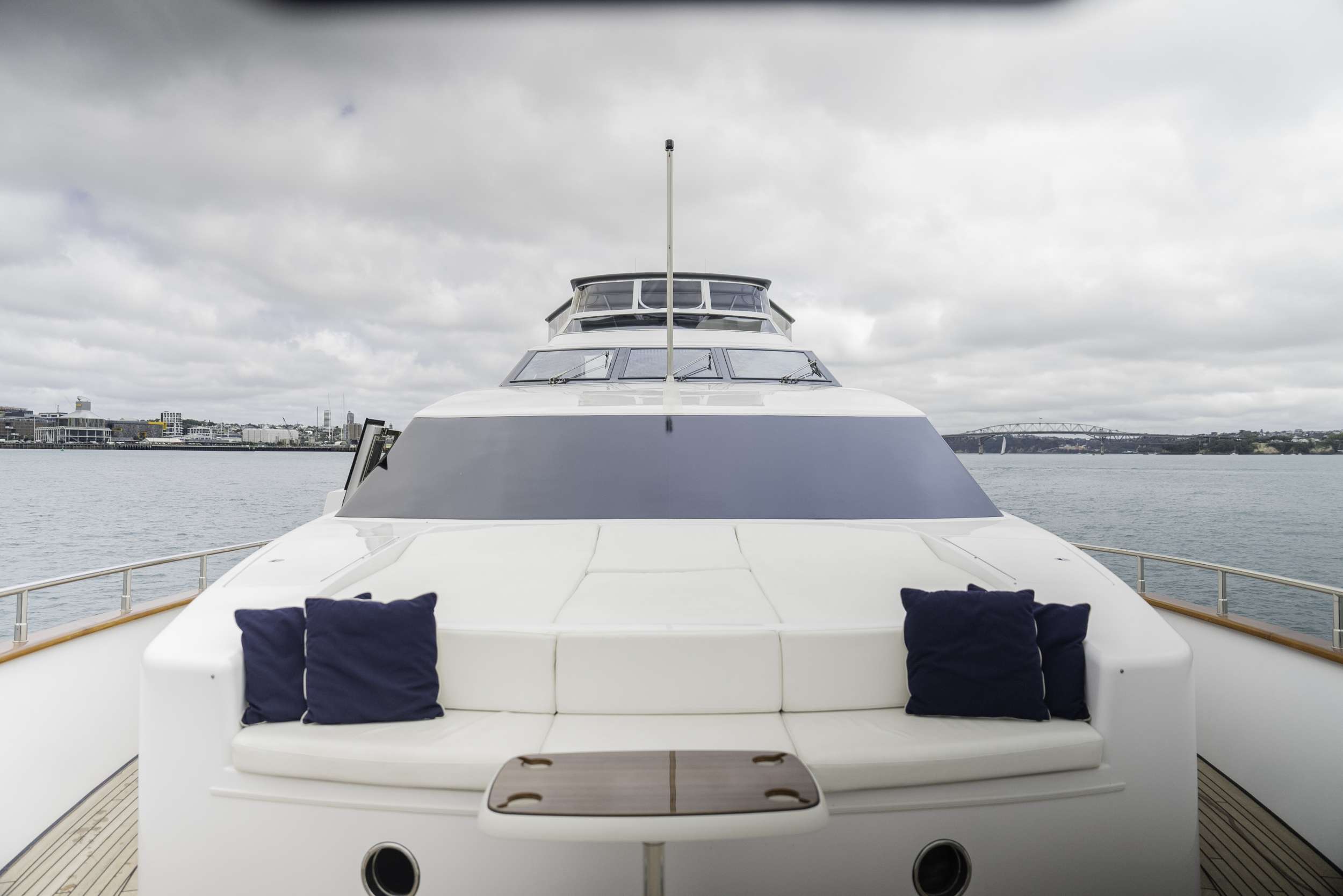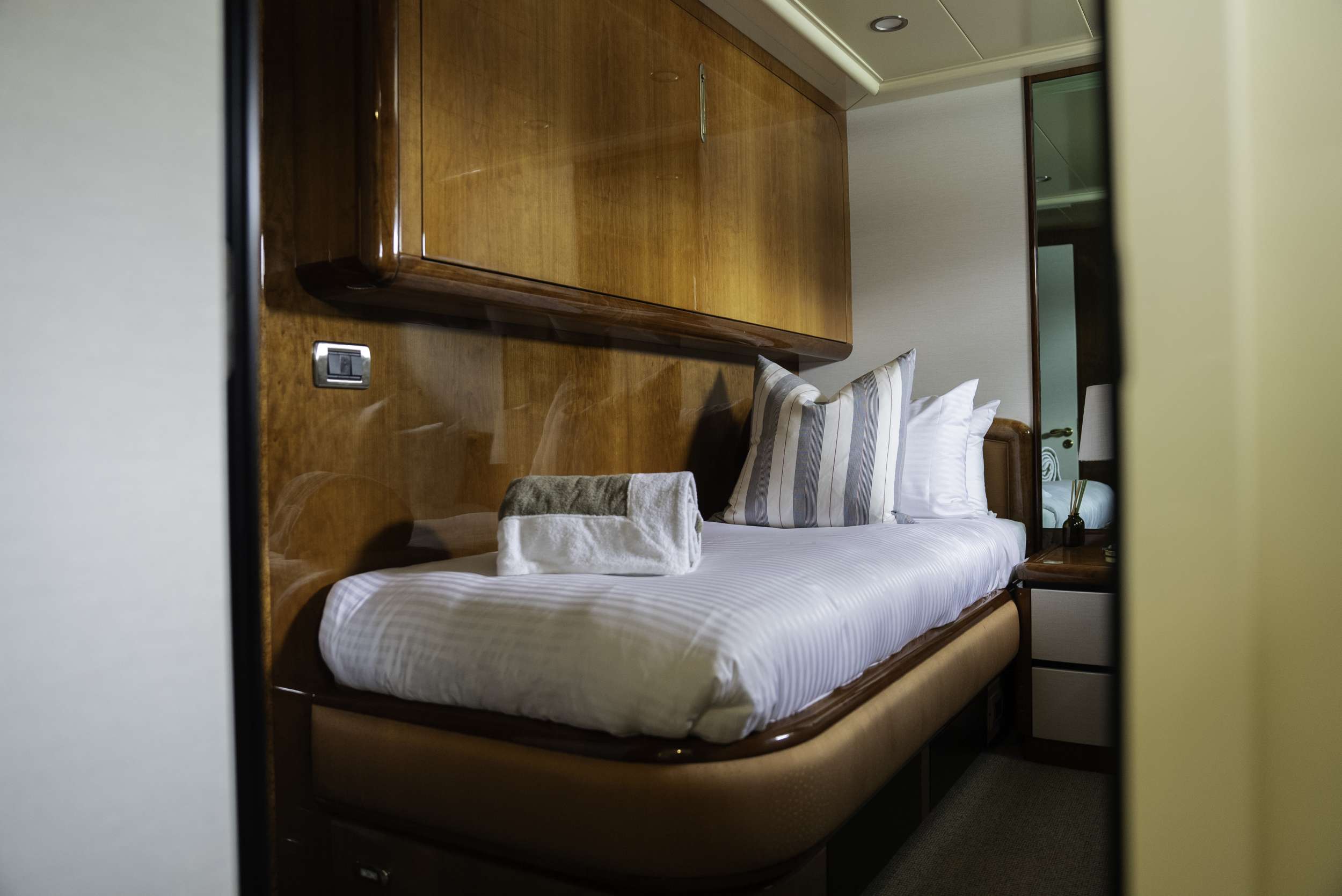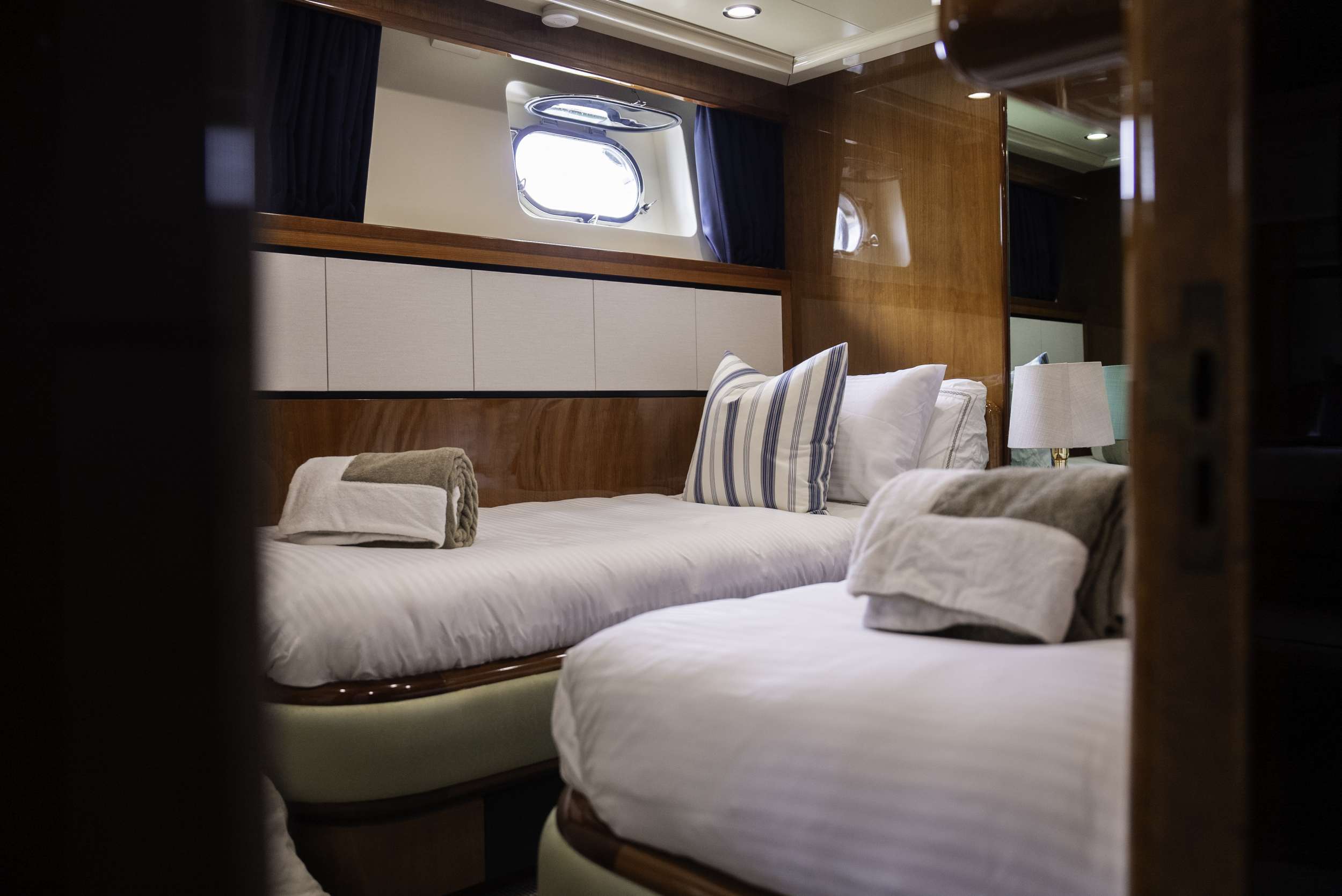 Four staterooms with en-suites. Full beam master and VIP with king and queen beds respectively. Two twin staterooms with Pullmans.