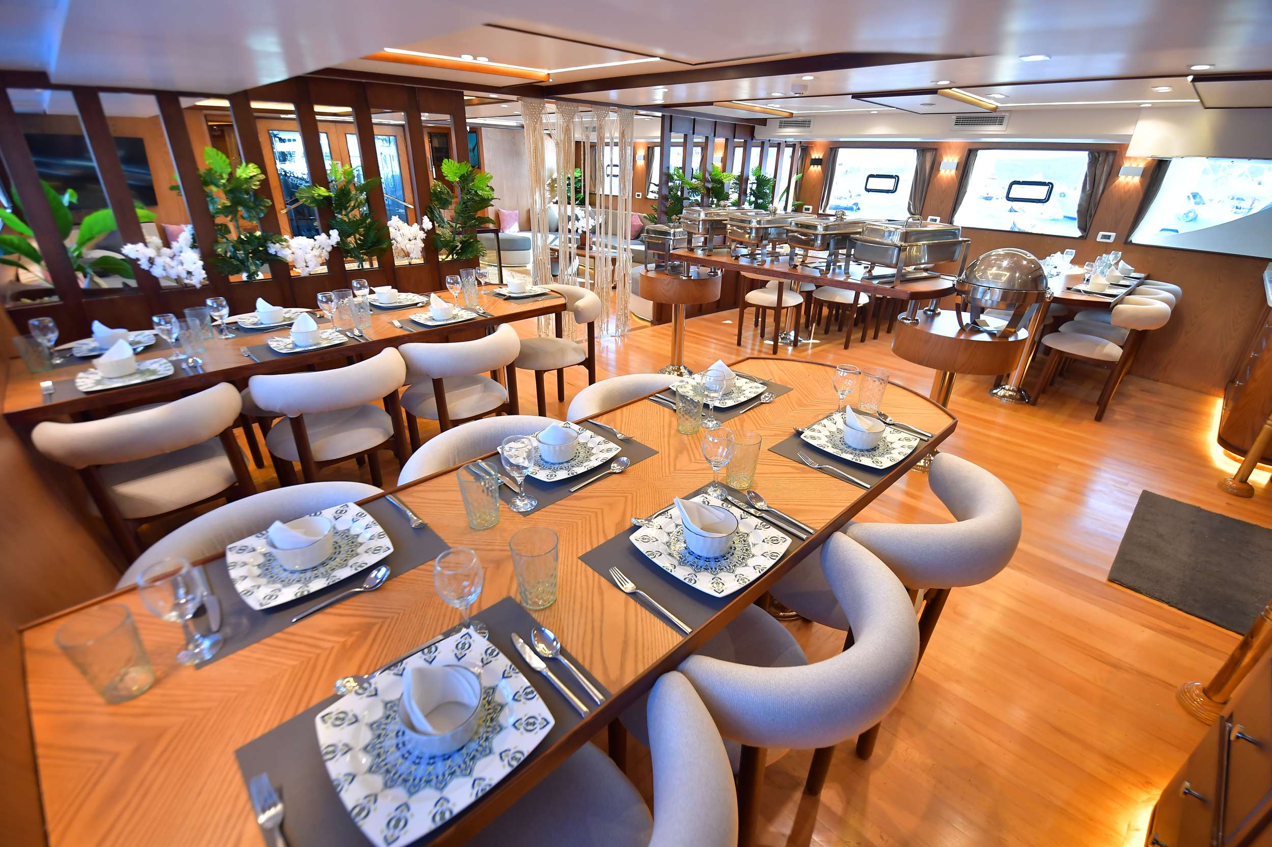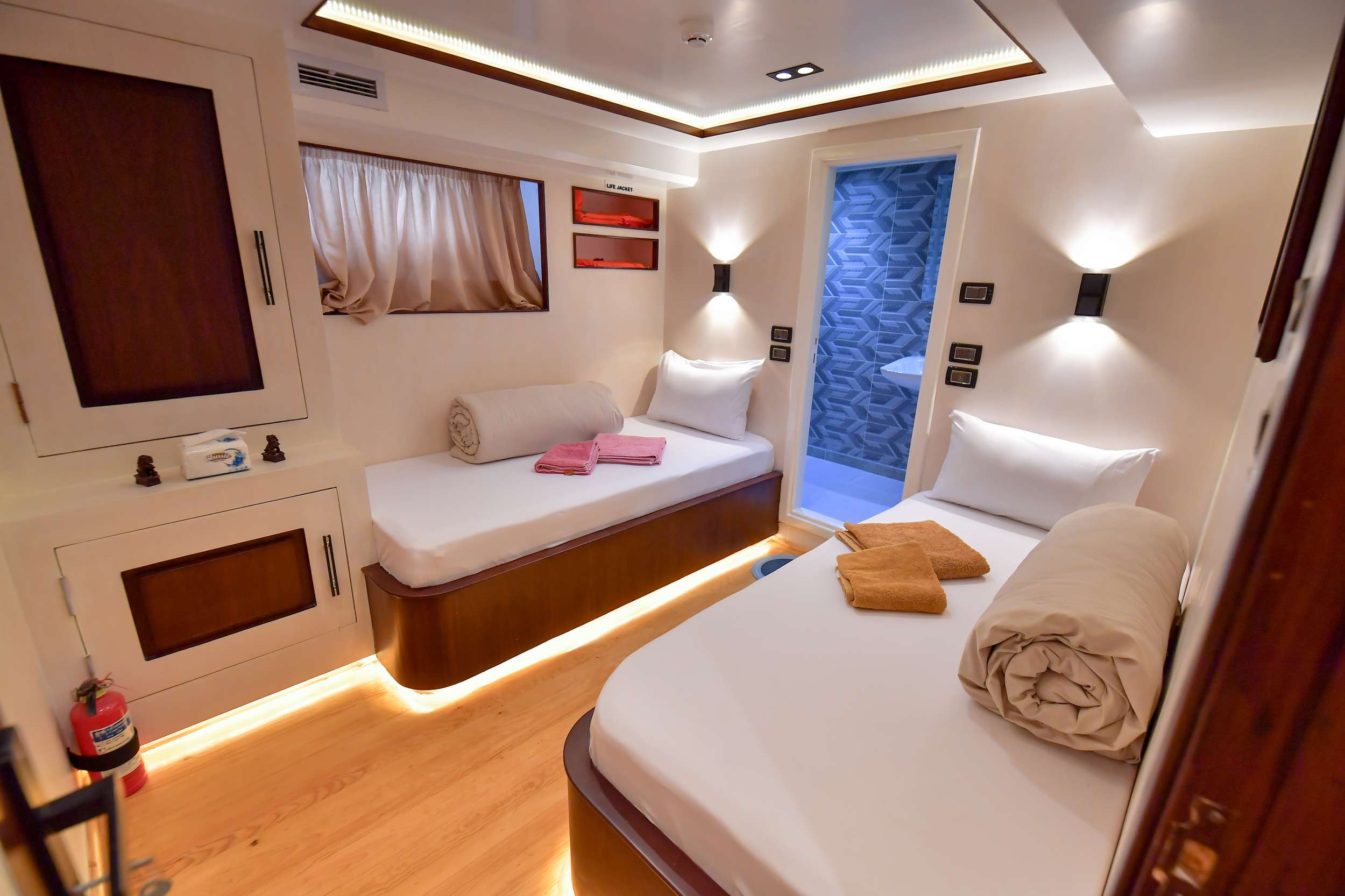 The yacht accommodates up to 20–22 guests in well-appointed cabins, each featuring air-conditioning and private en-suite bathrooms for maximum comfort throughout the voyage. Guests can relax in the air-conditioned salon and dining area, enjoy panoramic sea views from the upper deck lounge, or unwind on the spacious sun decks between dives.